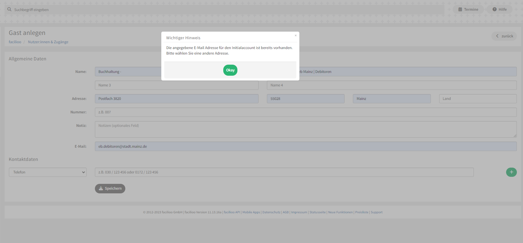 Legt man einen Gastaccount an und löscht diesen wieder, ist keine erneute Anlage mit der selben E-Mailadresse möglich.