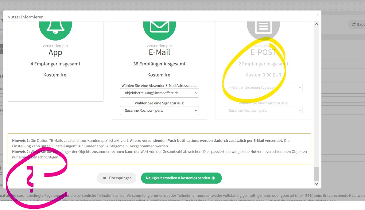 Normalerweise erhält man bei "Nutzer informieren" einen Warnhinweis, welche Nutzer weder per App noch per Mail erreicht werden können. Dieser Warnhinweis fehlt jetzt. Die Nachricht wurde mit Hilfe eines Verlaufseintrages aus dem Vorgangsverlauf heraus erzeugt (falls dies für die Nachvollziehbarkeit eine Rolle spielen sollte ....).